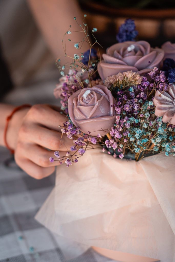 os arranjos florais onde misturam velas em forma de flores, com flores secas,