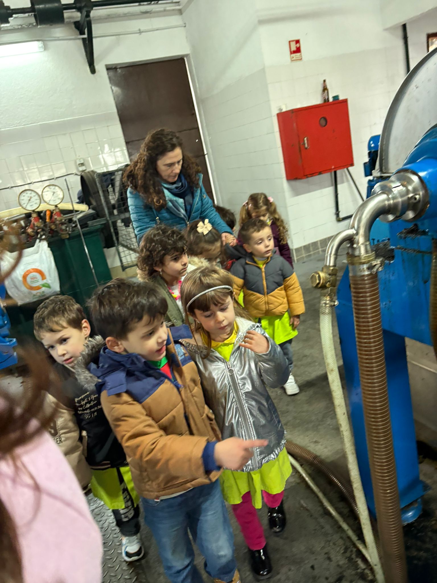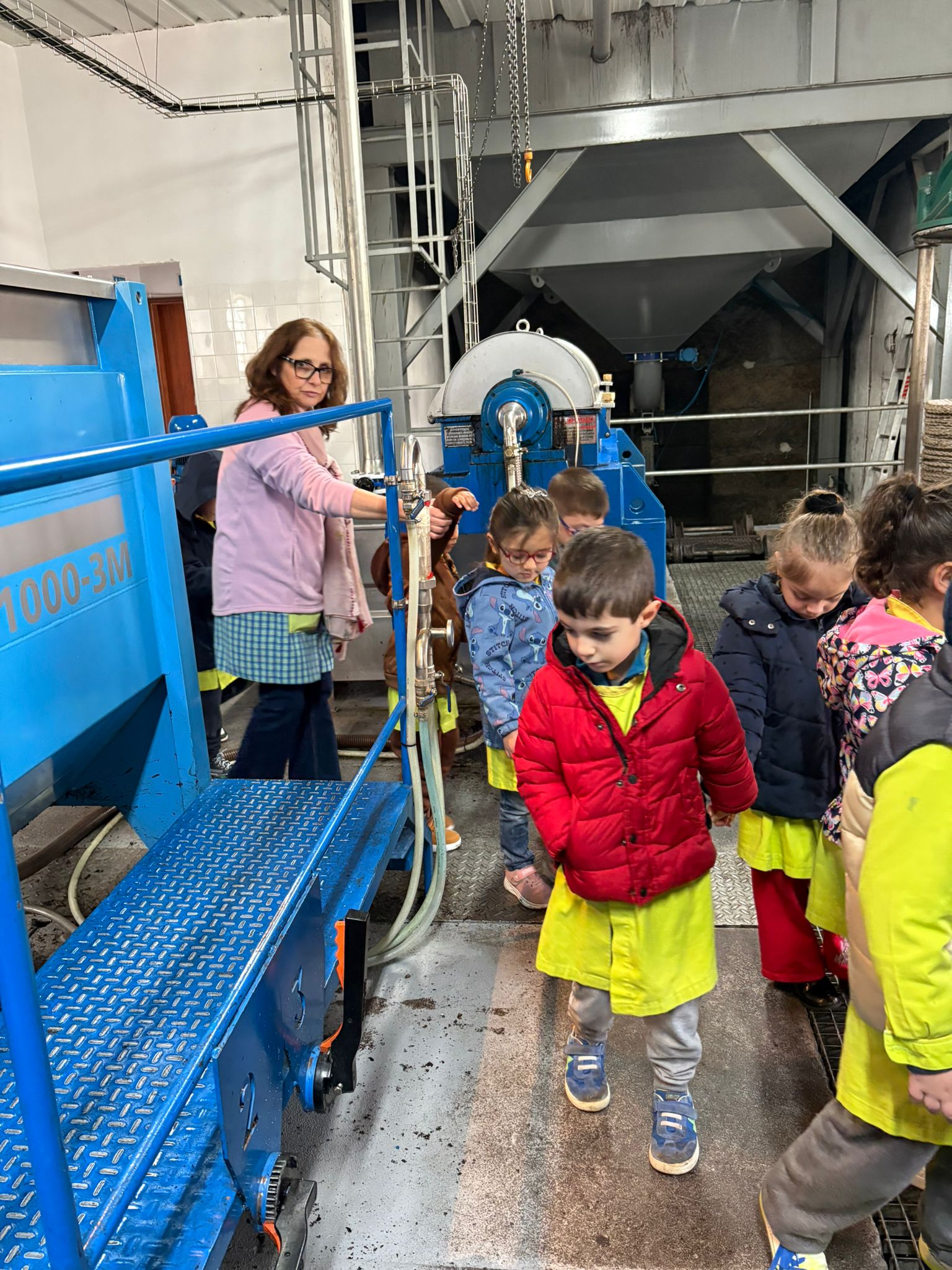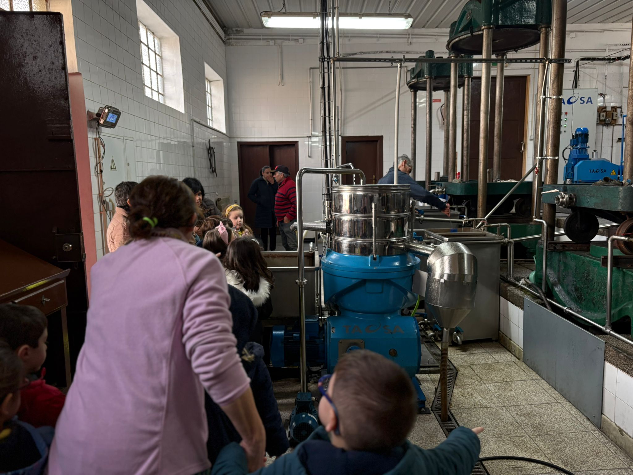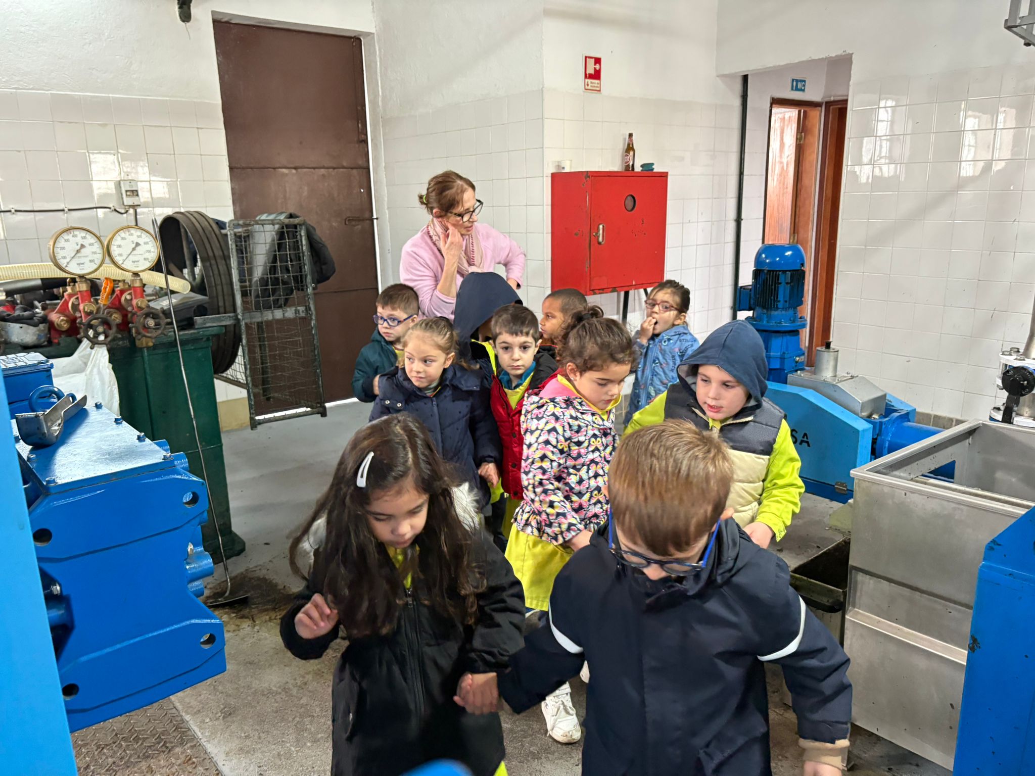 Ao longo da visita, os alunos tiveram a oportunidade de observar o funcionamento do lagar, conhecer as diferentes etapas do processo de transformação da azeitona em azeite e ouvir as explicações do responsável pelo espaço, Henrique Ferreira.