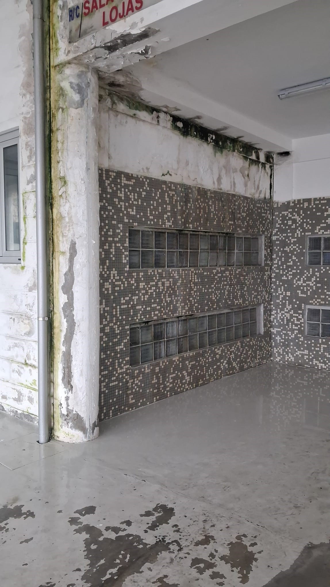 paredes cheias de água, de humidade, cheias de teias de aranha, água no chão,
